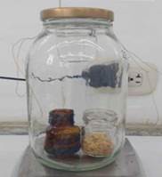 An incubation test was used to determine the biodegradation of ELO and OP as a function of the microorganisms' metabolic activity by quantifying CO2 production (respirometry tests). The bio-adsorbents were incubated separately in hermetic glass jars with a 500 mL capacity. At the bottom of each jar, two smaller jars or vials were placed: one (amber) with 10 mL of sterile distilled water to maintain the humidity of the medium, and another one containing 2 g of dried bioadsorbent and 8 mL of a Pb (II) and Cr (III) solution at 450 mg/L (M1) (Figure 1). Controls consisted of 2 g of sterilized plant-based material and 8 mL of distilled water (M2), an empty glass jar (M3), and 8 mL of the Pb (II) and Cr (III) solution (M4). The CO2 that evolved during the incubation test was trapped with 20 mL of NaOH 1 N placed in 30-mL vials on the upper part of the jar. All setups were evaluated in duplicate. The M1 setup was incubated for 46 days for ELO and 60 days for OP. Control tests M2, M3, and M4 were analyzed three times during the assay (beginning of the test, middle of the test, and end of the test), according to the time established for each matrix. All incubations were performed at room temperature (20±1 °C).