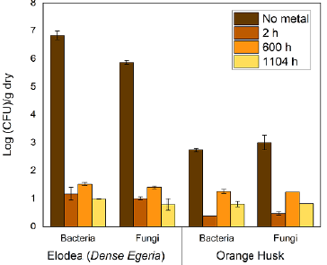 With respect to fungi, there was mycelial growth with sporulation starting on day 19 for OP (with black pigments) and on day 25 for ELO (with white pigments and radial growth between 1 and 3 cm). The proliferation of fungi -especially those with morphologies with 1 to 3 cm of growth- can be problematic for filter design because they can plug filters, obstructing the flow of water to be treated. There may be viable alternative treatments using fungi that take advantage of their contaminant-adsorption properties (e.g., using pulverized biomass), but further investigation of those possibilities is needed.