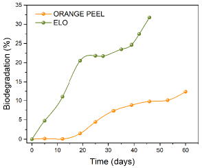 When comparing the production of CO2 with microbial growth over time (Figure 3), there is a direct relationship with microbial development phases. There was an exponential phase between days 5 and 25 for ELO and between days 5 and 32 for OP (Figure 3a and 3b) during which the plant-based materials were easily biodegradable. This was followed by a stationary phase between days 25 and 30 for ELO and days 39 and 53 for OP in the CO2 production curve. Finally, there was a cell death phase. During the last few days of the test, there was a slight growth, since dead microbes can be a substrate for successive microbial populations (Pérez-Bou et al., 2018).