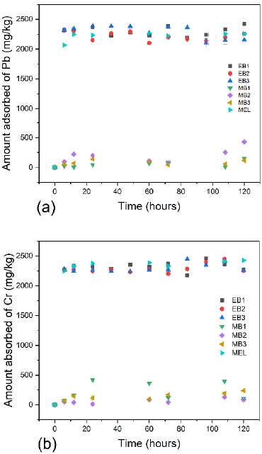 ELO was chosen as the bioadsorbent in which to test the capacity of its associated microbes in order to remove Pb(II) and Cr(III) because it had more microbial growth, including strains that were tolerant to the metals of interest. According to Bojórquez et al. (2019), microbial population growth (i.e., increasing cell density) can increase the total availability of active sites for metal adsorption over time. Figure 5 shows the amount of Pb (II) and Cr (III) adsorbed in ELO with the presence (EB1, EB2, and EB3) and absence (MEL) of microorganisms, as well as the adsorbed quantity of metals by microorganisms (MB1, MB2, and MB3) over time. The adsorption kinetic data of Pb (II) and Cr (III) in ELO with and without microorganisms (EB1-EB3 and MEL) were well fitted by the linear form of the pseudo-second-order equation (R2 > 0,99). There is an affinity between bioadsorbent and metallic ions, which are attracted to the solid (Andrago, 2011) starting at 6 hours of contact. After 12 hours, small fluctuations occurred in the retention of Pb (II) and Cr (III) in ELO with and without microorganisms. At 12 hours, a state of equilibrium was reached between metals, ELO, and microorganisms. Hemavathy et al. (2021) reported that the pseudo-first-order equation fitted well to adsorption kinetic data of Pb (II) in Cassia fistula seeds. The pseudo-first-order model is only appropriate for the initial 20-30 minutes of the contact time between metal and bioadsorbent (Tran et al., 2017).