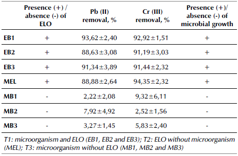 The treatments EB1, EB2, and EB3 did not increase the removal of Cr (III) by the bioadsorbent. The bacteria labeled as EB1 increased Pb (II) adsorption in ELO (Table 3) with a p-value < 0,05. There was no significant metal removal by bacteria in treatment T3 (MB1, MB2, and MB3; p-value > 0,05). The treatment T3 showed the lowest adsorption of Pb (II) and Cr (III) in comparison with the MEL treatment (ELO showed high removal of metallic ions, 88,79-94,34%). Thus, the ELO-associated bacteria can persist in environments polluted with these metals, but they did not use Pb (II) and Cr (III) for their metabolic processes. This was further confirmed by growing cultures in nutrient agar to identify microbial growth for each treatment over time. For ELO treatments, there was growth (+), while, in the inoculated MB1, MB2, and MB3, growth was absent (-) (Table 3). This may be because, at a concentration of 50 mg/L, the metals saturated the cell membrane, disabling the metal resistance mechanisms (Jaros+awiecka and Piotrowska-Seget, 2014).