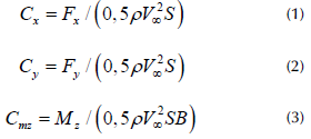 where B is the bottom width of the structure perpendicular to the wind direction; V: is the wind speed; p is the air density; S is the projected area of structural members along the wind direction; Fx, Fy, and Mz are the forces and torque along the x, y, and z axes, respectively, as obtained by the HFFB test; and C, C, and C are the aerodynamic coefficient components along the x, y, and z axes, respectively.