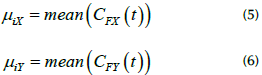 The aerodynamic coefficient is the ratio of the actual wind load on the structure to the theoretical value of the average wind load obtained from the average test wind speed and the reference area. It reflects the influence of the aerodynamic shape of the structure on the distribution of the wind load. To convert the test data into a wind load time history applied to the real structure, the test data obtained by the wind tunnel test were expressed by the dimensionless aerodynamic coefficient, which is calculated as follows: