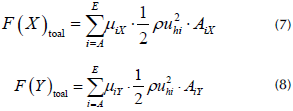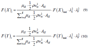 ii) The wind load actually borne by the TF1000 was then assumed to be composed of the loads on five section models. Equations (7) and (8), which are applicable at any time, were solved, where F(X)total and F(V)total are the forces of Model F in the x and y directions, respectively; uhi is the wind speed at the corresponding height of section model i; and Aix and AiYave windshield areas in the x and y directions of section model i, respectively.
