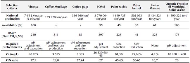 The selection of potential substrates for biogas production was performed through a literature review, considering different criteria such as the annual national production of each waste and its availability, the adequacy of the biomass or the pretreatment requirement for its use in the anaerobic digestion process, and the values reported for physicochemical factors associated with the process, i.e., the methanogenic potential, the organic matter content represented by the amount of volatile solids, and the presence of nutrients such as carbon and nitrogen, with an optimal carbon-nitrogen ratio (C /N) from 20 to 30, which is essential for the growth of microbial communities (Rivas et al., 2016; Lohani et al., 2018). Then, the ones considered to be substrates with the most interesting features for AD and biogas production in Colombia were characterized, and their methanogenic potential was experimentally evaluated.