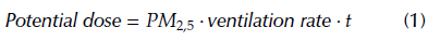 where the potential dose is in µg, PM2,5 denotes the particulate matter concentration (µg/m3), the venilation rate is in m3/min, and t is the exposure time by exertion level (min).