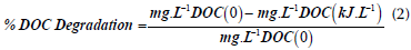 To calculate the response variable representing the DOC, reported as a percentage (%) of degradation in each TiO2/ pH combination, a sample was taken at time zero of the treatment. This value is then calculated in comparison with the other accumulated energies via Equation (2). This sample collection process is carried out in amber containers with a 60 ml capacity. Once collected, the samples pass through membrane filters and are prepared for DOC measurements in the Teledyne Tekmar Torch Total Organic Carbon Analyzer.