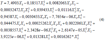 With the dataset in Table 3, a multivariate polynomial regression model was developed in the MATLAB Online R2020b software. The degree of the polynomial was set at n = 3, obtaining an R2 = 0,8652. For lower degrees, the model did not fit correctly, and, for higher degrees, it showed overfitting. Some researchers state that an R2 = 0,8 clearly indicates a very good regression model performance and explains a significant amount of the variance in the data (Chicco et al., 2021). In our case, other models were tested with a fourth-degree polynomial, obtaining an R2 of around 0,9. However, we noticed that the model's curve was overfitted to the experimental data. Therefore, the reported R2 was considered to be more adequate in explaining the variance of our experimental data.