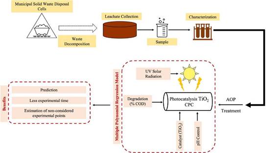 Our methodology consists of four stages: collection and characterization of the leachate sample, which is the input for heterogeneous photocatalysis, followed by multiple polynomial regression modeling, and finally, results analysis (Figure 1).
