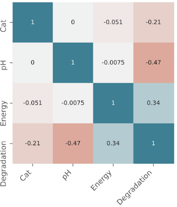 Figure 3 shows the correlation between the independent variables and the response variable: degradation - ph = -0,47; degradation - UV = 0,34; and degradation - catalyst = -0,21. The highest correlation is found with pH; the higher the pH, the lower the degradation. The same happens with the catalyst, which, in higher quantities, impairs the degradation process. Finally, regarding the UV dose, which maintains a direct proportional relationship, the higher the accumulated energy, the higher the degradation. This was confirmed by Jia et al. (2013), who achieved the highest removal percentage in the longest UV-radiation exposure time. Thus, this analysis is consistent and reproducible with the results obtained via the RSM.