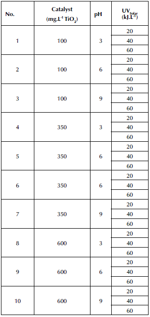 The StatGraphics Centurion XV statistical tool was used for the experimental design, given its capabilities for randomized testing and data visualization. Furthermore, a 32 factorial design with replication at the center point was developed to model the results using a response surface. The summary of the experiments is shown in Table 1. The influential variables measured for the factorial design were the catalyst dose (100, 350, and 600 mg. L-1 TiO2) and the pH (3, 6, and 9). These factors were considered since, when TiO2 has been used as catalyst in the presence of UV radiation, it generates a strong oxidant radical such as OH-, in addition to the fact that it is non-toxic and anti-corrosive and it features a high pollutant removal (Al-Mamun et al., 2019; Villamizar et al., 2022). Fluctuations in the pH level were considered in order to understand which wastewater conditions stimulate the production of hydroxyl radicals (Balarabe and Maity, 2022; Hassan et al., 2016; Yasmin et al., 2020).