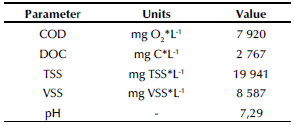 The COD is used to calculate the inlet concentration of the photocatalytic reactor. From 7 920 mg.L-1 COD, an inlet concentration of 500 mg.L-1 COD was determined for the process.
