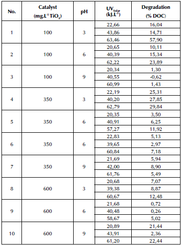 The results obtained during the TiO2/UV heterogeneous photocatalysis are consolidated in Table 3. Each experiment is specified in terms of TiO2/pH concerning the degradation percentages (DOC) for each measured accumulated energy value. According to what was proposed in Table 1, the latter was set at the values of 20, 40, and 60 kJ. L-1. However, since these values were measured every 10 min, they are close to the fixed values. This is why, in Table 3, this variable appears in decimal form; it depends directly on the solar irradiance on the days of the experiment, some of which were cloudy and others very sunny.