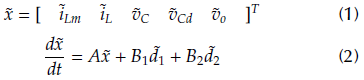 The averaged model of the converter is represented by a set of differential equations that consider the damping network and the turns ratio n = 1, as described in Erickson and Maksimovic (2007), where d1 and d2 correspond to the cycles of the switches Q1 and Q2. Likewise, the overline in the variables corresponds to the average during a switching period. Likewise, linearizing the set of differential equations, in conjunction with the small-signal state vector given by Equation (1), the dynamic model is shown in Equation (2), where A is the state matrix, and B1 and B2 are the input vectors corresponding to