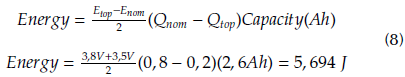 A simplified lithium-ion battery (LIR18650, 2, 6 Ah model) was used in this work EEMB (2010). This model took into account only the nominal region of the discharge capacity, from Qtop to Qnom values. Here, the energy management algorithm always works between the voltage ranges of Etop and Enom. The main advantage of this model is that it is easy to obtain the parameters from the datasheet provided by the manufacturer. In the linear region, the battery model can be modeled as an RC series branch with a SOC in the [20, 80] % range, where the C-value models the charging and discharging behaviors. The discharge behavior in the nominal region is required in order to size the energy storage. The area under the curve was obtained through Equation (8).