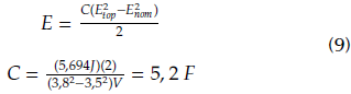 However, to obtain the reference voltage of 48 V, an array of six branches connected in parallel was proposed. Each branch contains 14 cells connected in series. The capacitor value was obtained from Equation (9) while the series resistor value comes from the datasheet provided by the manufacturer EEMB (2010). The equivalent RC series branch for the selected ASD is presented in Equation 10.