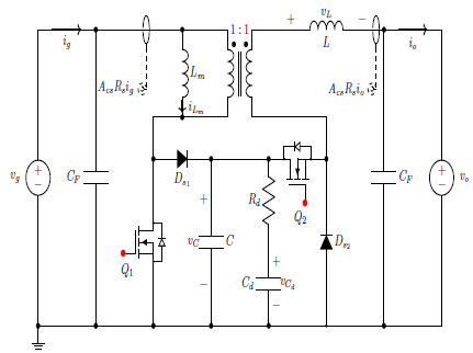 The converter consists of a Boost stage in cascade, connected with a Buck stage with magnetically coupled inductors, with an included damping network. The scheme of a Buck-Boost converter with current sensors is shown in Figure 2. The damping branch consists of a series of resistances Rd and a capacitor CF connected in parallel to the capacitor CFBendib et al. (2015).