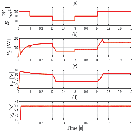 In Figure 5c, once the irradiance decreases, the voltage also decreases, until it stabilizes at Vgmin = 30 V, as shown for the time interval from t2 to t4, which regulates the PV array voltage at the minimum operating value. On the other hand, from t4 to t5, when the irradiance increases to 1000 W/m2, the panel voltage reaches 65 V in order to provide the total demanded power. In Figure 5d, the DC bus voltage behavior is shown at the reference value of Voref = 48 V and under a 3, 3 Ω constant load, maintaining this state regardless of variations in demanded power and irradiance.