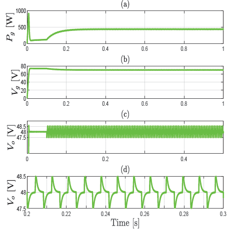 Figure 6a shows that, under a constant irradiance of 1000 [W/m2], the input power is stabilized at 410 W. Moreover, in Figure 6b, the output voltage Vg is stabilized through the MPPT algorithm, reaching the maximum power point and with no significant increases or decreases in the input voltage. Figure 6c validates the DC bus voltage regulation loop. Finally, in Figure 6d, there are DC bus voltage ripples of 1 V throughout 0, 1 s. This disturbance in the load represents a demanding scenario, with 76, 92 % of the maximum power, which corresponds to 768 W.