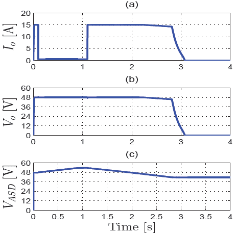 Figure 7a shows a saturation of the current reference 7gref1 = 16 A, with an initial constant load of 3, 2 Ω until t = 0, 1 s. Then, from t = 0, 1 to t = 1, 1 s, the maximum ASD voltage VASDm„x exhibits the required performance, while a load shedding is deployed, considering a constant load of 100 Ω. On the other hand, from t = 1, 1 s onward, the load is fully reconnected and shows an adequate behavior in the current output. Finally, Figure 7b shows the DC bus voltage drop Voref , while the ASD minimum reference voltage VASDmin achieves the reference value in Figure 7c.