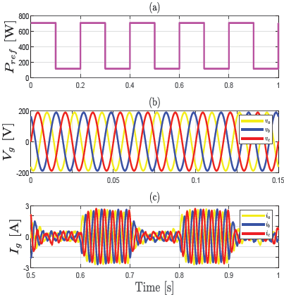 In this scenario, the dynamics of the DC system are included using a square signal, whose maximum and minimum values correspond to 768 and 115, 2 W, respectively. This profile is shown in Figure 8a, whuch includes the active power control loop mentioned in the previous section. Figures 8b and 8c illustrate the three-phase voltages (Vg = [va, vb, vc]T) and currents (Ig = ia , ib,ic ]T) after considering the DC dynamics.