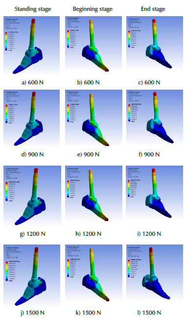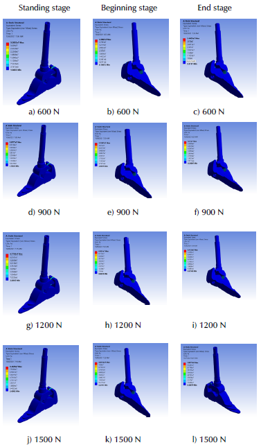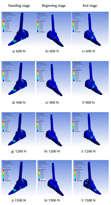 Figures 15 and 16 show the changing values of the equivalent elastic strain rates of the prosthesis, given the changes in the static and dynamic loads that occur during the walking and standing stages of the four patients analyzed. These Figures show that the highest equivalent elastic strains occur at the end of the walking step, reaching 0,00222 m/m with the highest patient weight (1 500 N). This value is higher than those at the beginning of the walking step (by 62,04%) and the standing position (by 68,18%). This is due to the fact that, at the end of the step, the required force increases during the last stage of contact with the ground. This, in order to help push the body forward, which entails an increase in the equivalent elastic strain rate.