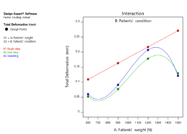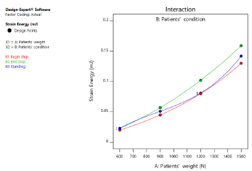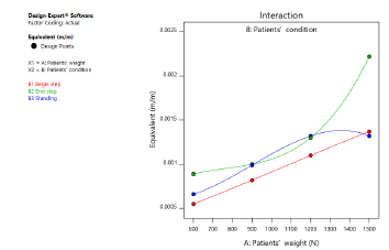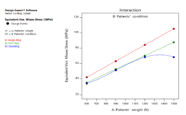 Figures 11 and 12 show the relationship between the equivalent von Mises stress for the prosthetic limb, the patients' weights, and the walking cycle stages. These simulations were performed using ANSYS 18.0, the RSM, and the statistical Expert Systems 11.0 software.