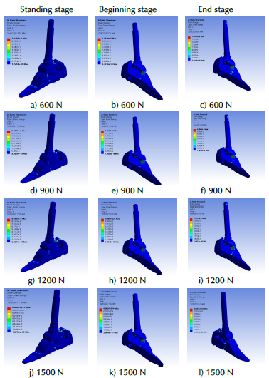 3- The highest total deformations reached 0,271 m. This value is higher than those at the end stage of the walking cycle (by 110,71%) and the standing stage (by 124,86%).
