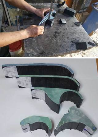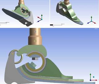 Figure 3 shows the design process of mechanically linking the laminated foot parts with the ankle pivot, as well as the parts of the ankle link with the pyramid adapter, using steel screws and nuts. Figure 4 shows the rotating process of the front edges of the prosthetic laminated foot parts.