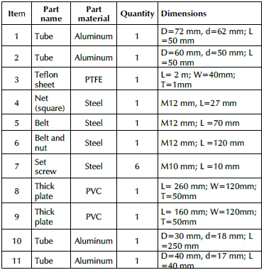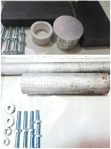 Several available raw materials were purchased for this work, including lightweight aluminum 6061 alloy tubes (tensile strength, yield strength, and ductility of up to 320 MPa, 280 MPa, and 10-12%, respectively) (Guanxia et al., 2020); a polytetrafluoroethylene (PTFE) ribbon for shock absorption and to increase the flexibility of the lower limb prosthesis, with a tensile strength of 161 MPa, a strain at break of 21,8%, an elastic modulus of 1 380 MPa, and a shear modulus of 27 MPa (Yingying et al., 2020); and two thick black polyvinyl chloride (PVC) plates with a tensile strength of 13,79 MPa, a strength at yield of 3,01 MPa, and a tensile strain at break of 230,18% (Zhang et al., 2021). The raw materials are shown in Figure 5. Table 1 provides a list of the materials required to manufacture the below-knee prosthetic limb.