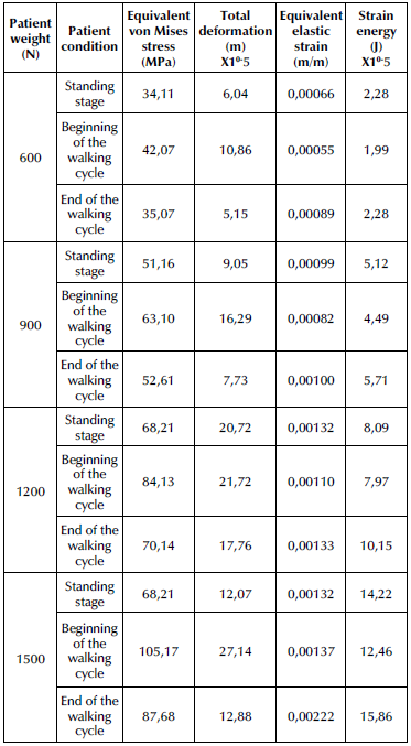 The mechanical properties of our proposed prosthetic limb were determined in four adult patients weighing 50, 75, 90, and 120 kg, using a safety factor of 1,2. The patients' total weights were applied to the prosthesis, i.e., 600, 900, 1 200, and 1 500 N. The results are shown in Table 2.
