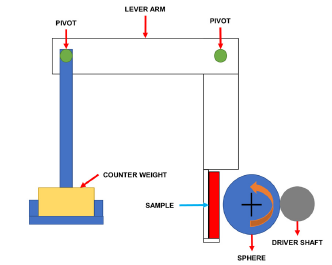 In this test, the sphere rotates in just one direction, and it is clamped against two coaxial transmission shafts that allow it to be easily removed and replaced. The square specimen is pressed by the rotating sphere from the side by means of loads placed on the test stand (Gant and Gee, 2011). The contact between the sphere and the specimen creates friction, which subsequently generates a crater-shaped wear track (Staia et al., 1998).