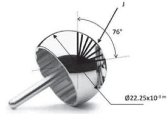 During testing with different angles of travel, it has been found that the hip can reach a flexion angle of 113° and an extension angle of 28°, which means that one of the angles to be examined is 113. The other angle is the sum of the flexion and extension angles, which is 141° (Boone and Azen, 1979). In hip joint replacements, one must consider the pressure that exists on the articular surface, which is transmitted by the acetabulum towards the femoral head, which means that the forces present in the hip act on a spherical area that is delimited by two planes at 76° (Figure 14) (Cañizo et al., 2010). Thus, 76° should also be included in the tests. Finally, the intermediate angles should also be evaluated, i.e., 45 and 90°.