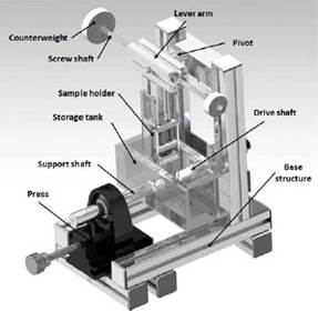 To develop the improvement plan, the starting point was a system (Figure 5) for conducting wear and micro-abrasion tests which has a square profile structure with a lever arm, where there are counterweights that, when moved along the axis that supports them, apply a certain load to the sample under analysis. A dynamometer is used to determine the load exerted by the dead weight and the counterweight. Moreover, there is a sphere that rotates against the sample for a certain number of cycles and at certain velocity, producing wear and abrasion on the sample.
