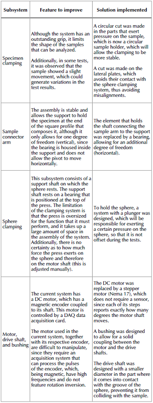 Based on an analysis of the system's operation, the most important requirements for any user are the compatibility of the samples, the modularity of the system, and the accuracy of the tests. These factors are fundamental in equipment for materials testing, which is why the possible points for improvement are framed in the requirements mentioned Table 1 (Caballero et al., 2016).