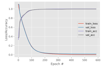 For the training process, training parameters were selected after several experiments and used for all the networks. A value of patience parameter was determined in order to track the learning process of the networks, aiming to make sure that the learning process continued as long as the model continued to improve. To this effect, the patience value was set at 100 epochs by experimenting, and validation loss was tracked during the whole training process of each network. This means that each network continued with the training process as long as the validation loss of the network kept decreasing. In other words, the network continued to learn. However, if the network stopped learning and the validation loss did not decrease for the selected patience value of 100 epochs, the training process would automatically stop, and the best weights of the training process would be restored before saving the model. As an example, Xception's training graph is shown in Figure 3. For comparison, the training of all networks was carried out with the same computer, which had 32GB DDR4 system memory, a 10th Gen. Intel Core i7-10750H processor, and an NVIDIA GeForce RTX 2070 SUPER graphics card with 8GB GDDR6 video memory.