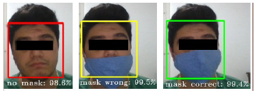 Figure 6 shows the output of our application for three different mask wearing situations. Boundary boxes are placed on detected faces, and the classification results are written with their confidence scores.