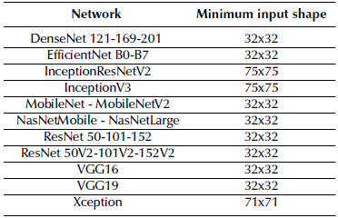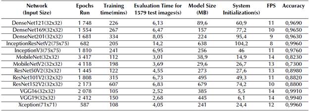 Table 4 shows the comparison between these studies and our research. It should also be considered that the input sizes of the networks were lower in this research, i.e., the minimum sizes accepted by the networks.