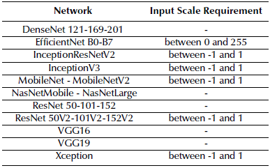The pre-processing stage was applied differently for each network depending on their properties. Each of the selected networks has a default input shape, and some of them also need the input data to be scaled between specific values for training. Since the goal was to train the network with as little data as possible, the minimum input shapes of each network were examined as shown in Table 1. The second most important thing was the rescaling of the input data in order to meet the network requirements. To this effect, each network's input scale requirements were found (Table 2) . Finally, the image was converted to grayscale in order to train with only one channel. Although these network inputs are generally three-channel images, grayscale images were used to reduce the input data. To summarize: first, the input image was converted to grayscale; then, the input image was resized to the minimum input size of the network; and the input data were rescaled according to the network's input scale requirements. For networks with no input scale requirements, the input data were scaled between 0 and 1.