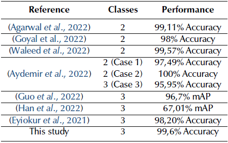 Aydemir et al. (2022) obtained results in three different cases. The first two cases involved two classes, and the third one used three. The resulting accuracies were 97,49, 100, and 95,95%, respectively.