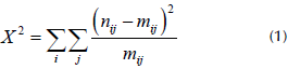 The observed frequencies were compared to the expected ones via Chi-square statistics, considering Equation (1):