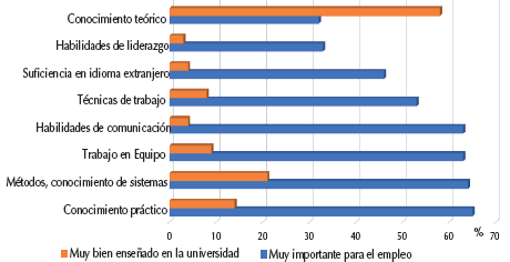 Es un hecho palpable la disparidad existente entre el conocimiento que se enseña en la universidad y el demandado en las empresas (Becker, 2010). En general, algunas habilidades que las empresas consideran muy importantes no se están enseñando de manera suficiente por las universidades, con excepción de los conocimientos teóricos, como se puede apreciar en la Figura 1. Se requiere por tanto de cierto trabajo de acercamiento y acoplamiento de los contenidos y objetivos de formación formulados en los currículos actuales de Ingeniería, con el ámbito de actuación presente y futuro de los ingenieros.