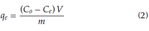 where Co and Ce (mg/L) represent the initial and the equilibrium concentration of the adsorbate in the solution, respectively. V(L) is the volume of the solution, and m(g) is the dry mass of the adsorbent.