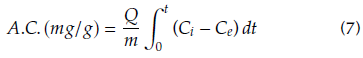 Batch adsorption studies allow to obtain the equilibrium data for a fixed temperature of the mixture. In this test, different ASA solutions were prepared at concentrations between 10 and 200 mg/L, at room temperature. The doses of adsorbent and pH of the solution were taken from the previous results. After a contact time equivalent to 2 h, the solutions were filtered and analyzed in a UV-1800 spectrophotometer (Shimadzu, Japan) at a wavelength of 230 nm. This determined the adsorption of ASA on the evaluated material (Gómez Rengifo, 2013). Mass of ASA adsorbed per mass of each utilized material qe , calculated according to Equation (2), is presented as a function of the ASA concentration Ce.