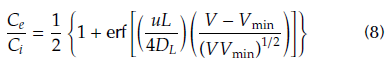where erf(x) is the error function of x, u is the interstitial velocity of the fluid, DL is the axial dispersion coefficient, V is the volume of the fluid sent to the packed-bed in an elapsed time, Vmin is the minimum volume required to saturate the bed and L is the bed length. The model parameters DL and Vmin were determined by nonlinear regression analysis (Arango Cardenas, 2015).