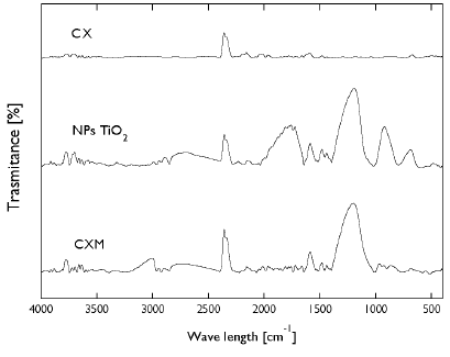 For carbon xerogel modified with TiO2 nanoparticles, a peak at 3695 cm-1 was observed (Fig. 1). This band can be attributed to the Ti-COOH between the nanoparticles and carbon material. Bands between 2978 and 2870 cm-1 correspond to the presence of alkenes, carboxylic acids, secondary amines and phenols, whereas bands between 1188-910 and 1 581 cm-1 are associated with the presence of the Ti-O-C bond. Likewise, bands between 1728-1600 cm-1 correspond to the vibrations of stretching and flexion of hydroxyl groups bound to titanium Ti-OH atoms, whereas between 1489-1435 cm-1 are bands corresponding to CH3 deformation (Bitar Castro and Mejía Meza, 2015; Fornaris Lozada, 2015; Hudlikar, Joglekar, Dhaygude, and Kodam, 2012; Santhoshkumar et al., 2014). CXM shows peaks between 2877-2401 cm-1 and 686 cm-1 corresponding to the presence of alkenes, C-N and C-H groups. Bands at 2360 cm-1 and 2993 cm-1 are related to the presence of carboxylic acids and aromatic or aliphatic C-H groups. Bands at 3780, 1589 cm-1, 1481-1422 cm-1, and 1094-779 cm-1, are associated to hydroxyl group adsorbed in the sample, the presence of Ti-O-C group and the CH3 deformation, respectively. These peaks demonstrate that the carbon xerogel was effectively modified with TiO2 nanoparticles.
