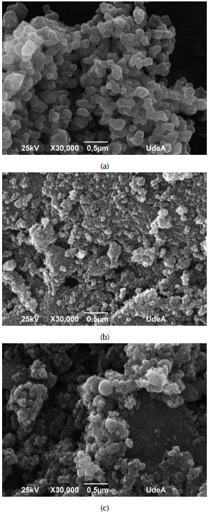 Figure 2 shows the scanning electron micrographs (SEM) of carbon xerogel, TiO2 nanoparticles and modified carbon xerogel. It is observed that nanoparticles are agglomerated, with a rounded structure and different sizes (Figure 2a). Activated carbon xerogel exhibits a smooth surface with a non-homogeneous particle size distribution, in addition to the formation of macropores, where TiO2 nanoparticles can be deposited and ASA molecules adsorbed in the removal process (Figure 2b). For the modified carbon xerogel (Figure 2c), the micrographs show TiO2 nanoparticles uniformly distributed on the surface of the material. These results agree with some previous studies, such as those by Álvarez et al. (2015), and Herrera, Reyes and Colina-Márquez (2016), where SEM images exhibit similar morphologies.