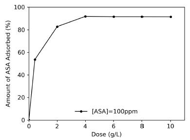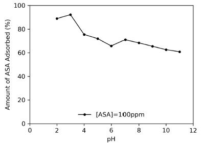 The pH of the experimental solutions was adjusted from 2 to 11 by addition of HCl and NaOH solutions. The ASA concentration was fixed at 100 mg/L. Tests were carried out at room temperature and agitated at 150 rpm with a contact time of 7 h. Once this time was elapsed, suspensions were filtered, and the ASA concentrations were determined at λ = 280 nm, using a UV-1800 spectrophotometer (Shimadzu, Japan).