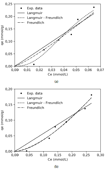 Langmuir (Eq. 3), Freundlich (Eq. 4) and Langmuir-Freundlich (L-F) (Eq. 5) adsorption models were used to fit the experimental equilibrium adsorption data (Álvarez et al., 2015)