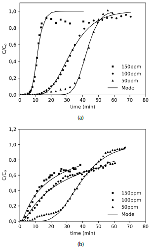 where Q (mL/min) is the feed flow rate, m (g) is the mass of the adsorbent, Ci (mg/L) is the influent concentration, Ce (mg/L) is the effluent concentration and t(min) is the adsorption time. For comparison purposes, the breakthrough point was taken at 10% of the initial concentration. Additionally, breakthrough curves were fitted with the axial dispersion model (Eq. 8), which assumes a dispersed plug flow through the bed characterized by an axial dispersion coefficient.